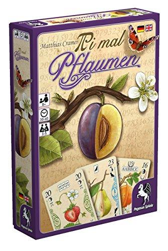 The name Pi mal Pflaumen is a play on the expression "Pi mal Daumen" — "rule of thumb" or "roughly" — which also originated in that period, but now instead of thumbs, players are concerned with fruit. On a turn, players play one fruit card from their hand at a time, then they each claim one of the played cards based on the strength of the card that they played. Each card depicts a fruit, and some of the cards also feature a scoring pattern (e.g., hand in three identical fruits or two pairs of matching fruits) or a special action, such as collecting an additional plum card, stealing a card from an opponent, taking the dog to protect yourself from theft, or collecting three π cards (which can be played singly or in combination with a number card to increase the value of your initial play).