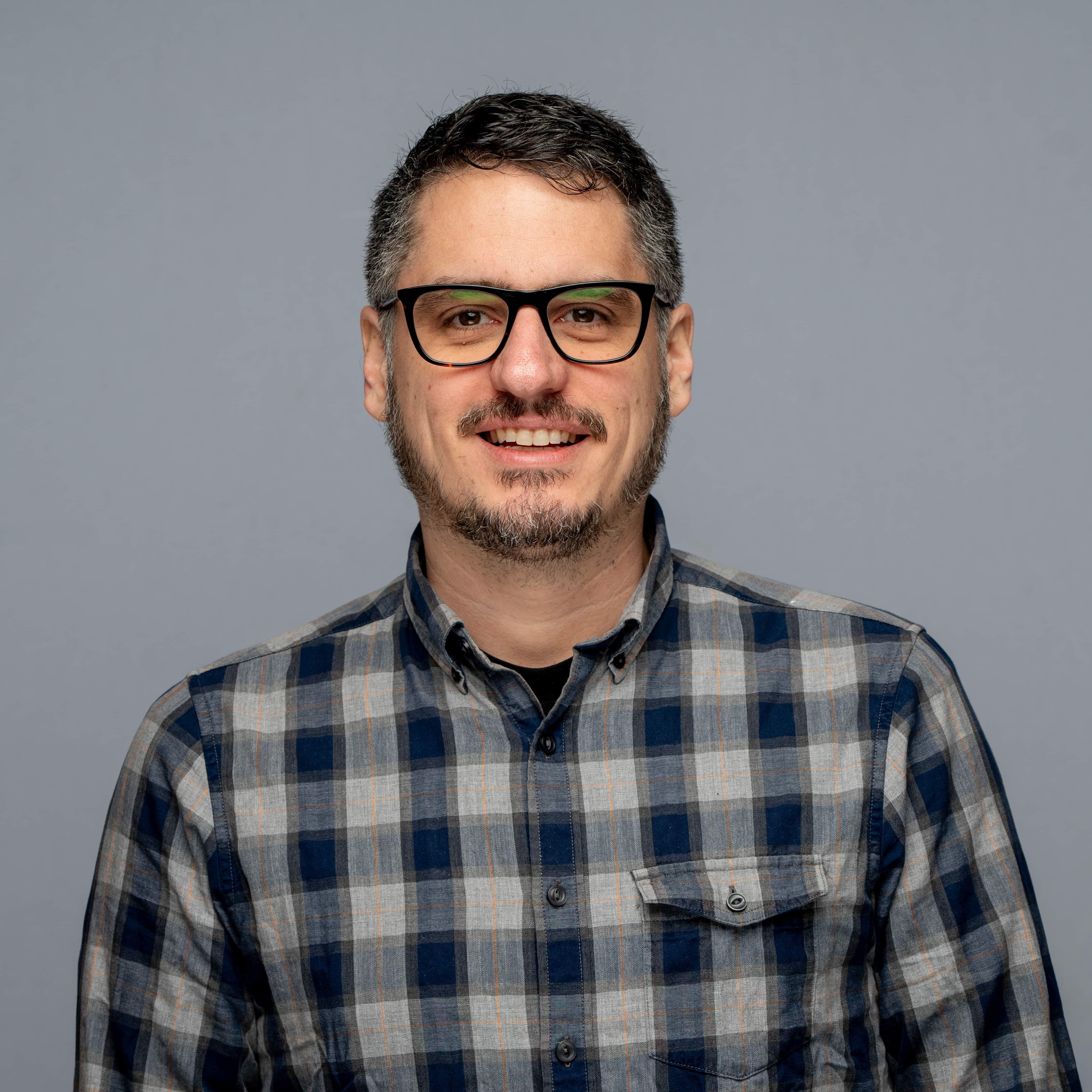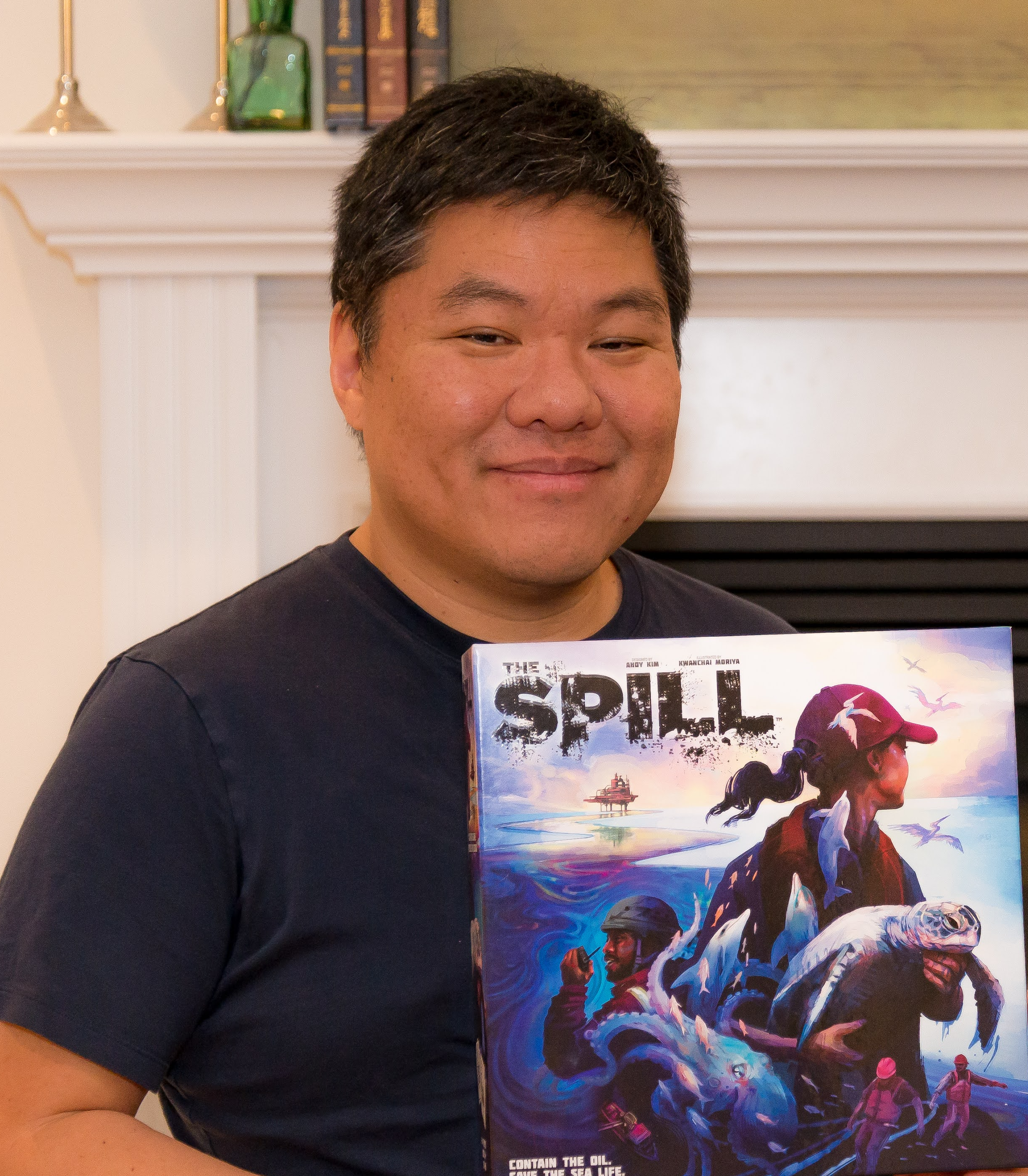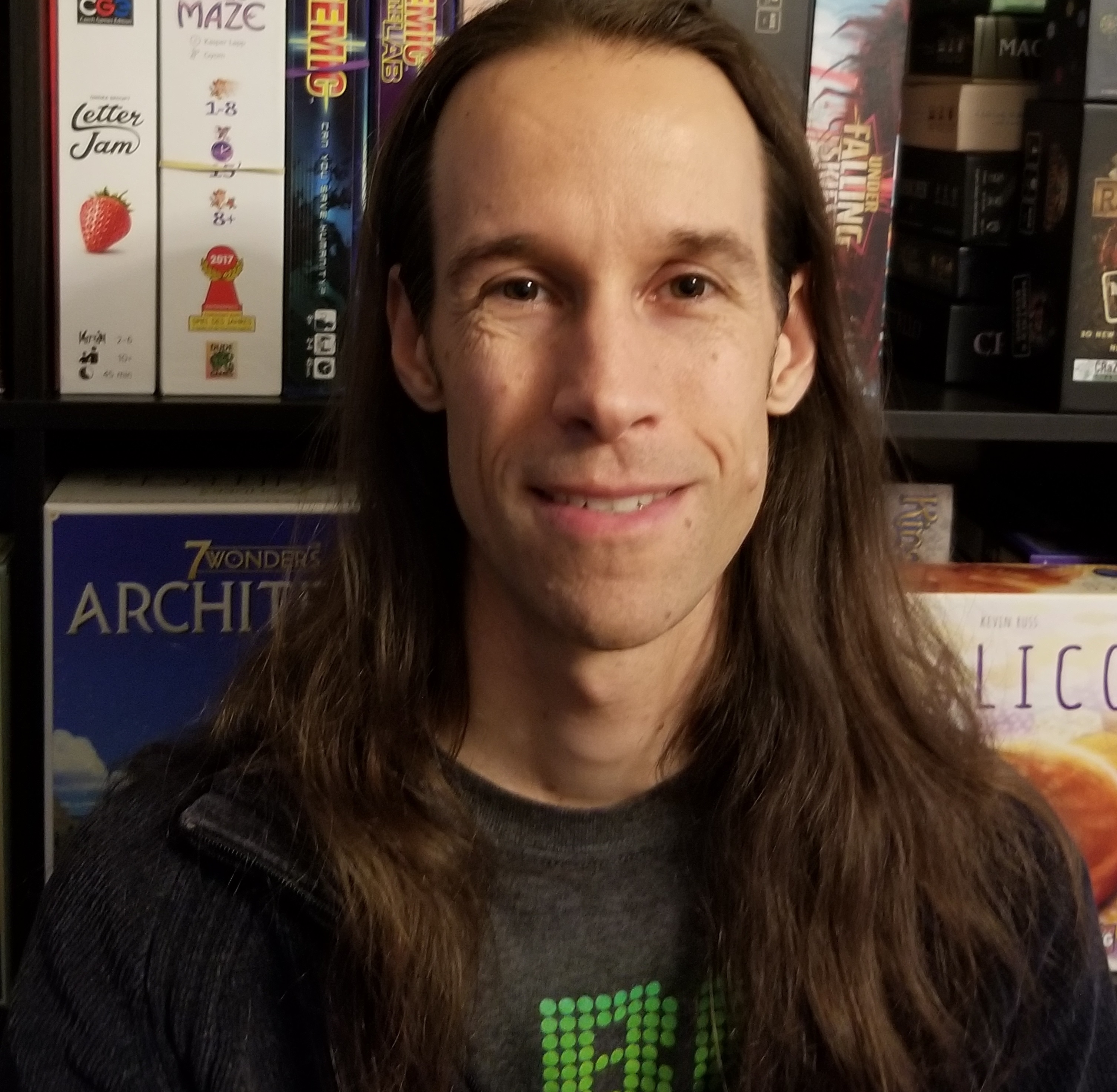 Photo of Joe Slack standing in front of a bookshelf of board games.