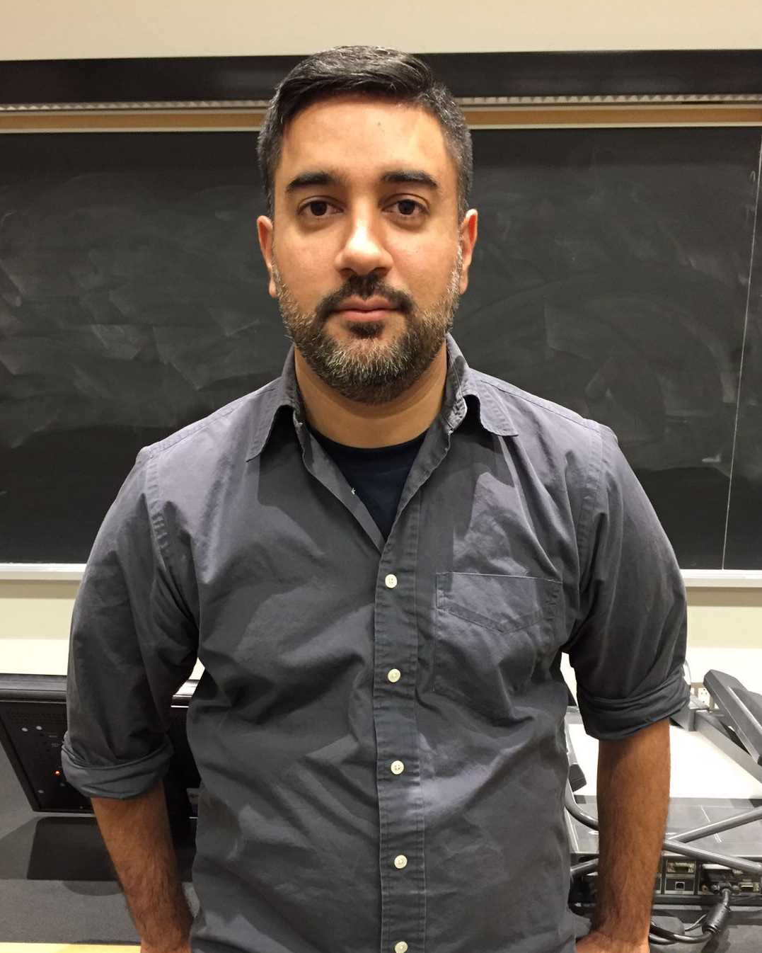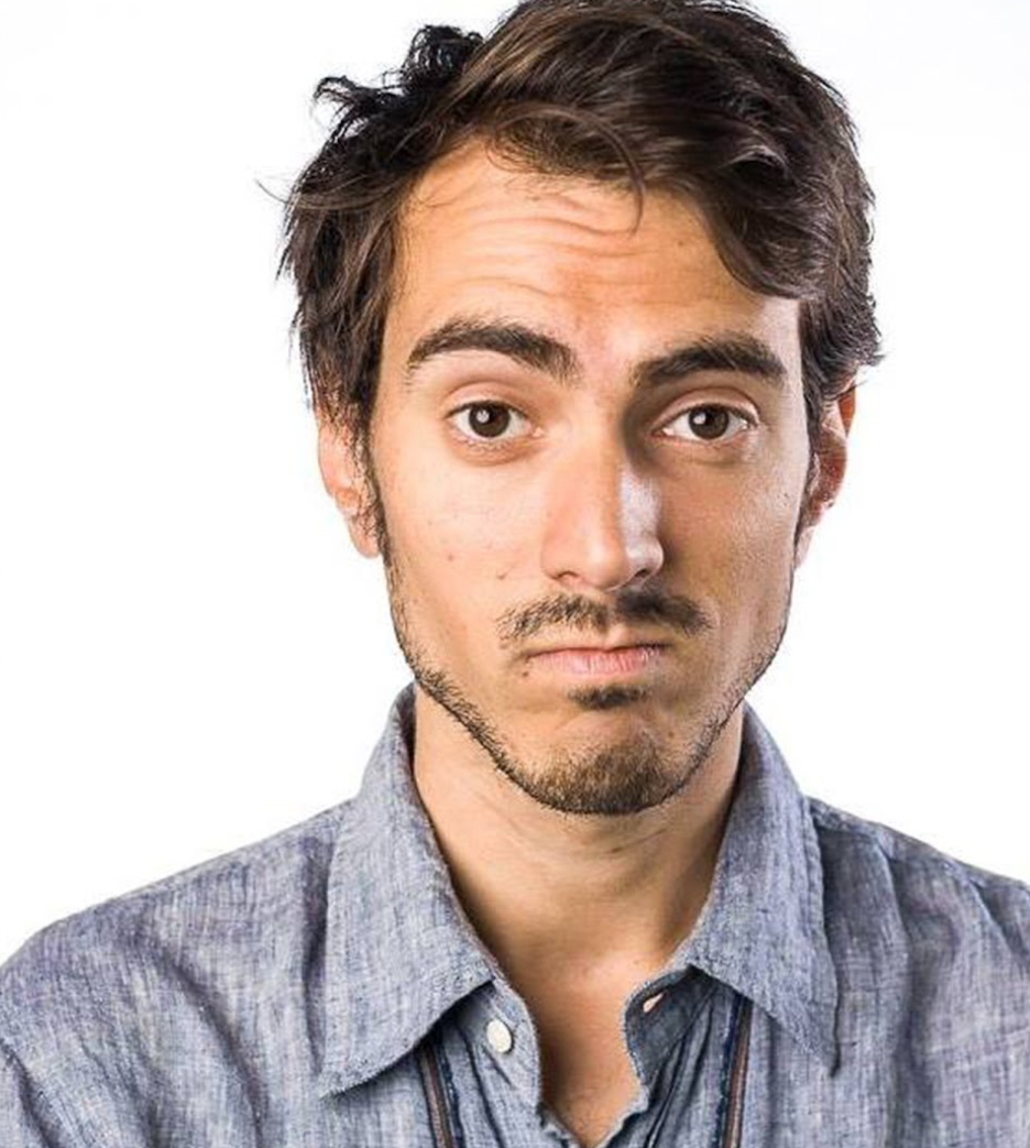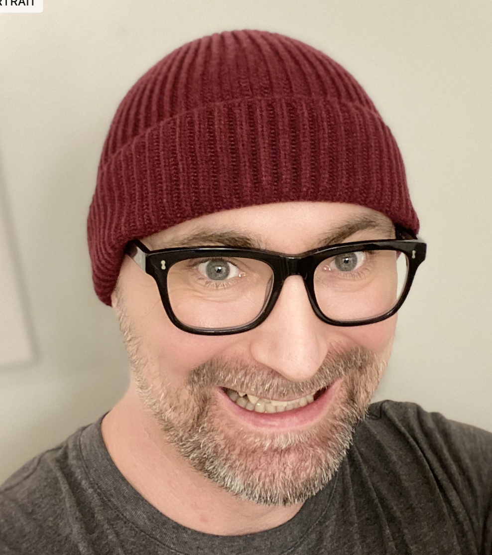 Photo of Joe Slack standing in front of a bookshelf of board games.