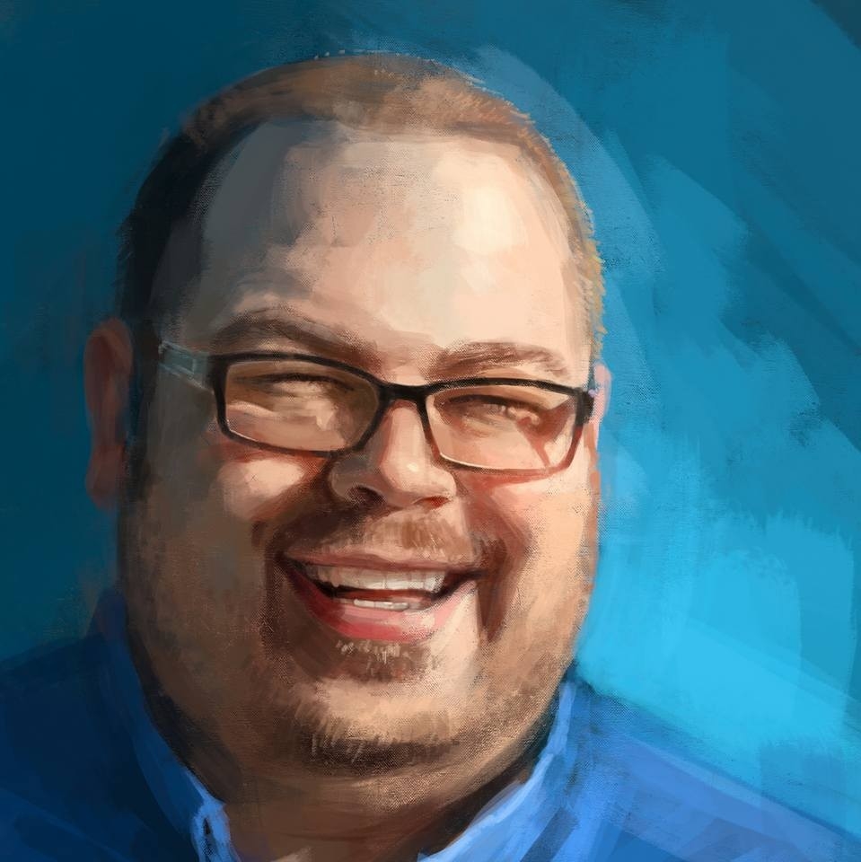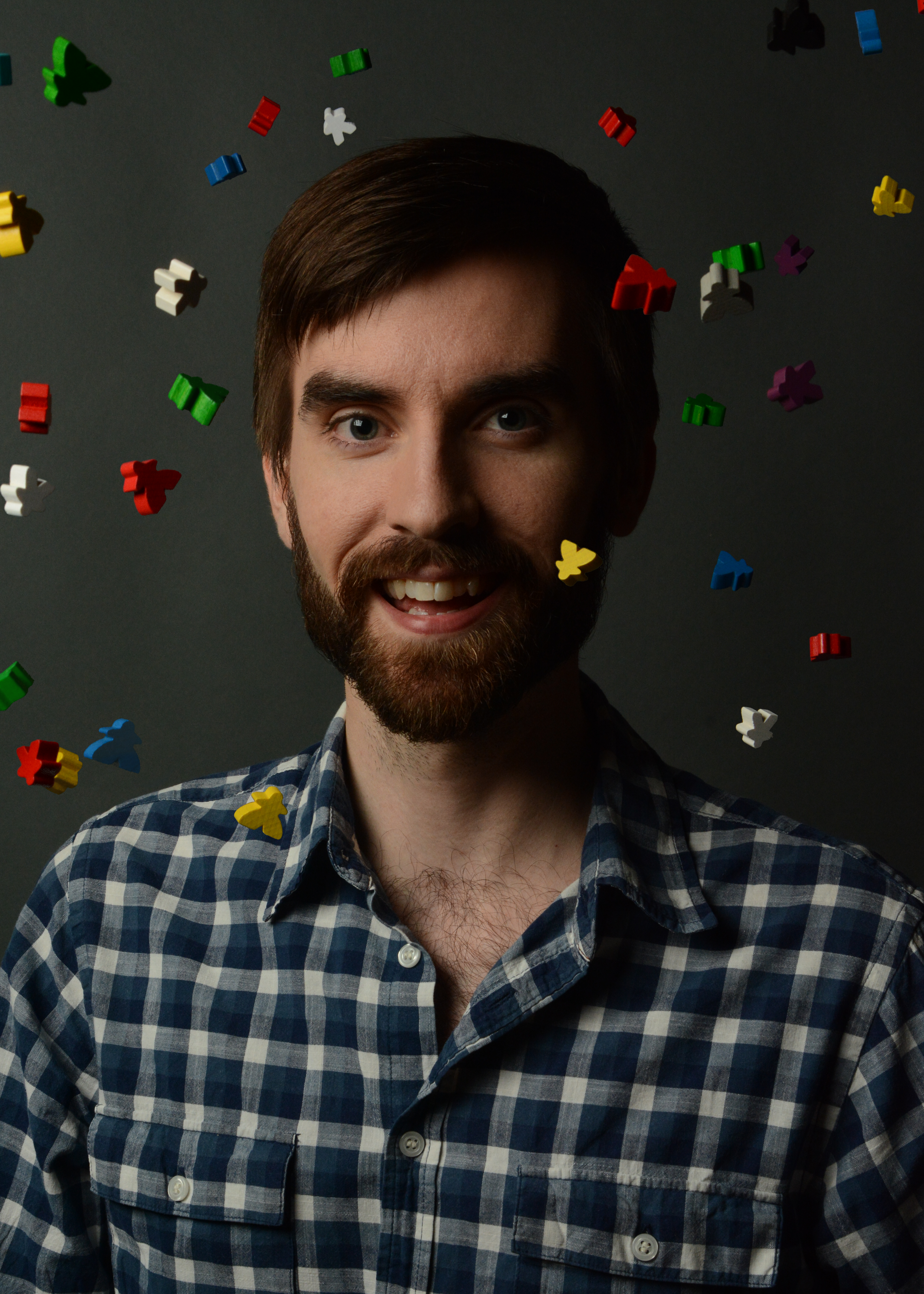 David Van Drunen surrounded by colourful meeples.